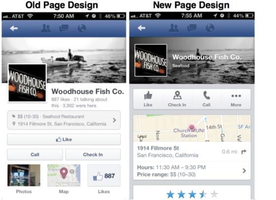 據美國科技博客TechCrunch報道,本周二,Facebook移動端品牌頁面(Pages)在改版后以全新姿態亮相,新版增加了本地商家的詳細資料、評級等功能,同時“贊”(Like)、“簽到”(Check-In)等按鈕的位置更靠前。