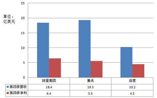 阿里巴巴集團、騰訊和百度去年第四季度業績