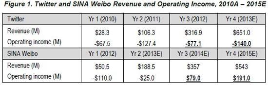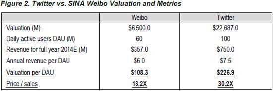 T. H. Capital報(bào)告指出,阿里巴巴第一步投資占股18%,新浪微博估值是32.6億美元,阿里巴巴會(huì)進(jìn)行第二步投資,再獲得新浪微博12%的股份,此時(shí)新浪微博的估值翻倍,達(dá)到65.1億美元。參照Twitter上市各項(xiàng)數(shù)據(jù),新浪微博這一估值并不算高。