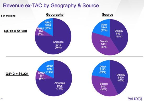 雅虎亞太地區(qū)的營(yíng)收從2012財(cái)年的11億下跌至2013財(cái)年的8.14億美元,下滑23%。從雅虎投資分析圖表可見(jiàn)亞太業(yè)務(wù)占據(jù)雅虎全球營(yíng)收的份額一年內(nèi)從18%降至16%。