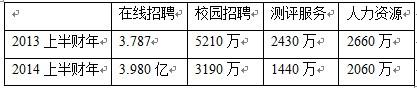 智聯(lián)招聘的財(cái)報(bào)數(shù)據(jù)以截至2012年6月30日的前一財(cái)年、截至2013年6月30日的上一財(cái)年、截至2013年12月31日的本財(cái)年上半財(cái)年為統(tǒng)計(jì)方式,以下簡(jiǎn)稱(chēng)2012財(cái)年、2013財(cái)年、2014上半財(cái)年,單位為元人民幣。