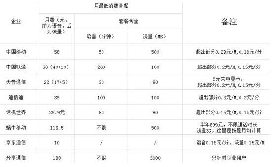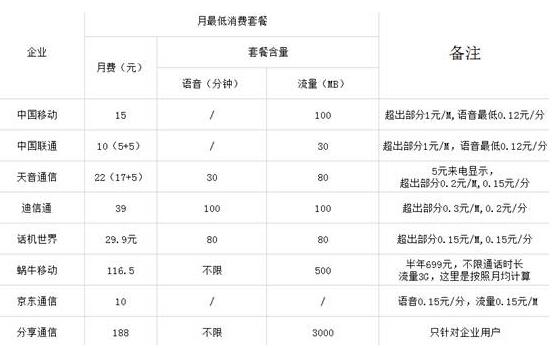 從表格中可以看出,一部分虛擬運(yùn)營商入門門檻較低,如天音通信、話機(jī)世界、京東通信等,月最低消費(fèi)均在30元以下,這些企業(yè)對于消費(fèi)能力較低的用戶來說,確實是不錯的選擇。