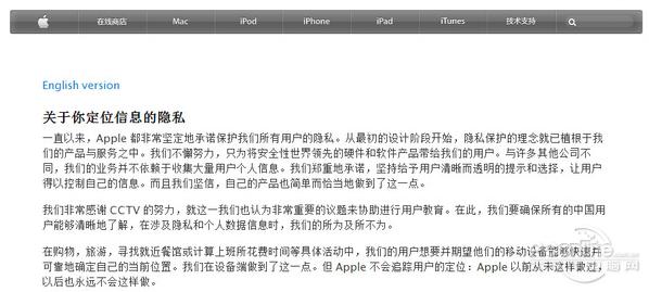 蘋果的聲明明確否認泄露用戶隱私,表明了iOS的定位功能是安全可靠的。“我們非常感謝CCTV的努力,就這一我們也認為非常重要的議題來協(xié)助進行用戶教育。在此,我們要確保所有的中國用戶能夠清晰地了解,在涉及隱私和個人數(shù)據(jù)信息時,我們的所為及所不為。”