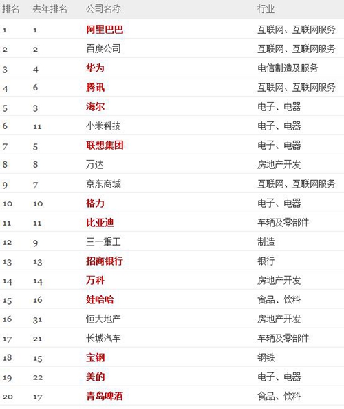 《財(cái)富》最受贊賞的中國公司全明星榜前20位企業(yè)一覽 (紅色表示該公司在過去六年中連續(xù)上榜)