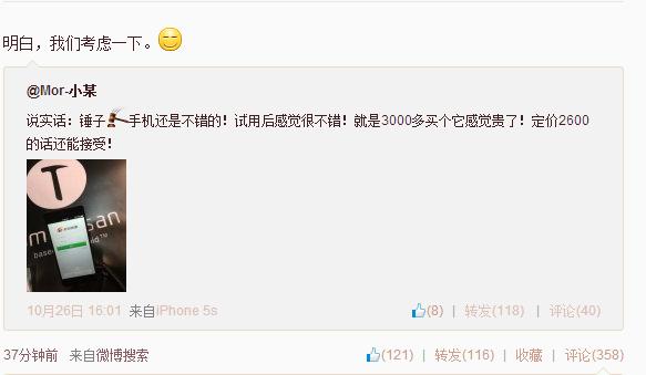 10月27日,羅永浩今日轉發錘子手機用戶的微博,表示考慮對手機進行降價。微博用戶@Mor-小某 昨日發微博稱:“錘子手機還是不錯的!試用后感覺很不錯!就是3000多買個它感覺貴了!定價2600的話還能接受!”羅永浩今天轉發了其降價的微博,并表示:“明白,我們考慮一下。“這可能是錘子手機降價的信號。
