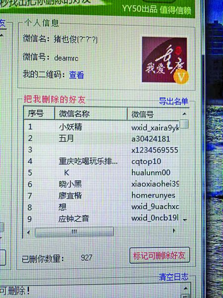 “原來我微信里躺著這么多‘尸體’。”昨日下午,草根微博大號“我愛重慶”陳泓宇也用該軟件對個人微信號“豬也俊”進行了測試,結(jié)果在3697位好友中,已有927位好友將他刪除。他忍不住自嘲:“為什么要刪我?大概是因為我刷屏、自拍和長得丑吧。”