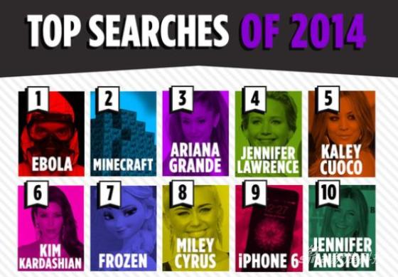 排在榜首的自然是埃博拉,各種傳言與恐懼已經遠遠大于疾病本身,也是網友搜索的焦點。Minecraft《我的世界》游戲位居第二,艷照門主角詹妮弗·勞倫斯(Jennifer Lawrence)第四。從不缺少話題的社交名媛金·卡戴珊(Kim Kardashian)憑借臀部放置酒杯接香檳再次走紅社交網絡,位列第六。《冰雪奇緣》電影排名第七,娛樂圈常青樹、《老友記》演員詹妮弗·安妮斯頓(Jennifer Aniston)在iPhone 6之后,排第十。