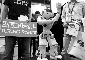 觀眾在觀看一款語音識別智能機器人。新華社發(fā)
