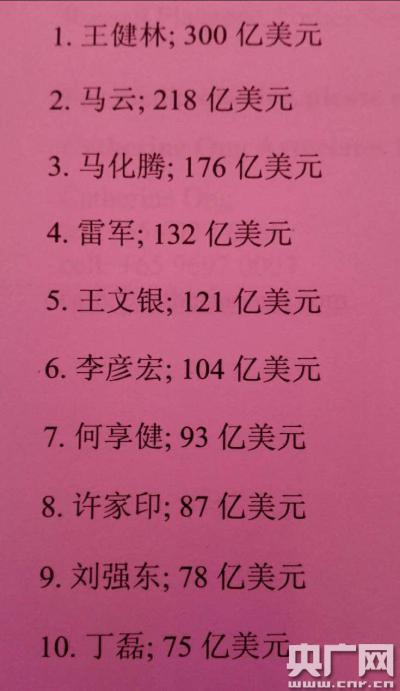 26日,《福布斯》雜志在京發(fā)布2015年福布斯中國富豪榜,萬達(dá)集團(tuán)董事長王健林勝過馬云,重回首富寶座 馬云由第一位跌至第二位,馬化騰則繼續(xù)維持第三位。前十位有6位來自互聯(lián)網(wǎng)行業(yè)。2015年福布斯中國富豪榜上前100名成員的財(cái)富總和從一年前的3760億美元增至4500億美元,增幅近20%。