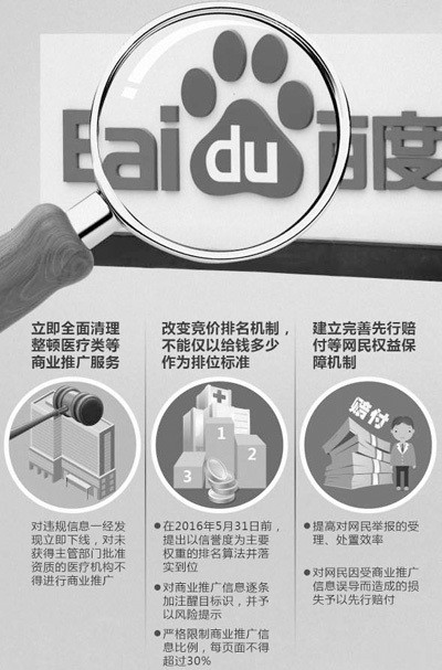 5月9日,由網信辦、工商總局、衛生計生委等部門組成的聯合調查組公布調查結果,認為百度競價排名機制存在付費競價權重過高、商業推廣標識不清等問題,影響了搜索結果的公正性和客觀性,容易誤導網民,必須立即整改。