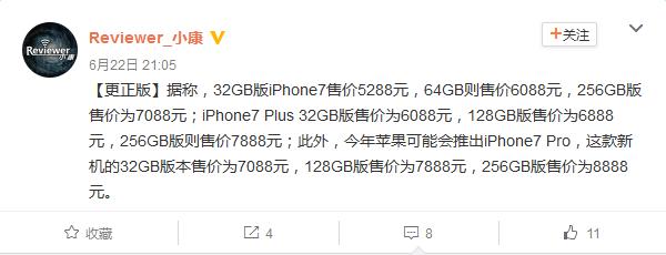 據國內網友@Reviewer_小康在微博中爆料即將發布的iPhone 7將會以32GB起步,共有三個版本供消費者選擇。其中標準版iPhone 7將會取消128GB版本,起售價格為5288元;iPhone 7 Plus起售價格為6088元,沒有64GB版本;而iPhone 7 Pro起售價格為7088元。