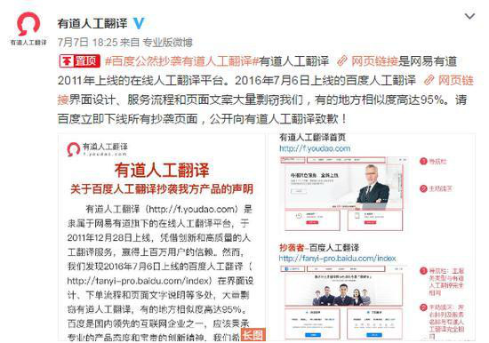 7月7日,有道人工翻譯官方微博發布長圖文,詳細列舉了6日上線的百度人工翻譯在界面設計、服務流程和頁面文案等方面剽竊有道人工翻譯,有些地方的相似度達到95%,并責令百度立即下線所有抄襲頁面,公開致歉。原微博已經獲得3600多次轉發,并引發不少主流媒體關注。