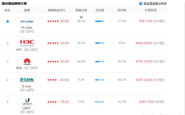 前五名榜首依次為TP-LINK、H3C、華為、D-LINK、UBNT,這個產(chǎn)品的排名說明了2個問題。