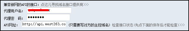 這里要求輸入代理用戶名、代理密碼以及API網(wǎng)址。代理用戶名和密碼參見說明文檔開頭設(shè)置的密碼。API網(wǎng)址填寫:http://api.west263.com。如圖: